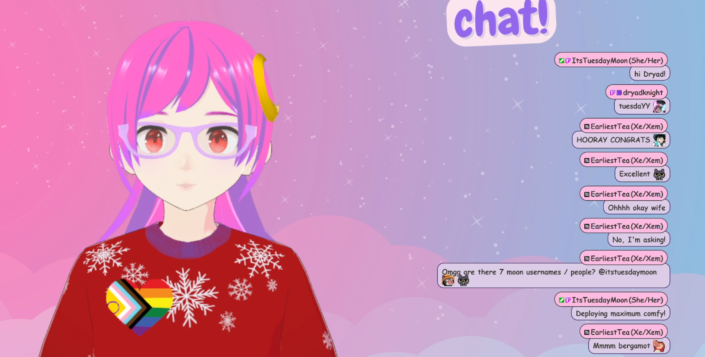 Because right now, you don’t even know if vtubing is fun for you or something you have time for. And that’s good! It’s great to run tests and try new things and see what you think! And as much as I love vtubing, a lot more goes on behind the scenes than most folks realize, from learning to puppet your model expressively to the ins and outs of bots and planning for special events. And if your goal is to make money, honestly it would be faster to learn Blender or digital art and make vtuber assets or even get a more traditional job. (And yes that’s even accounting for the state of the economy.)